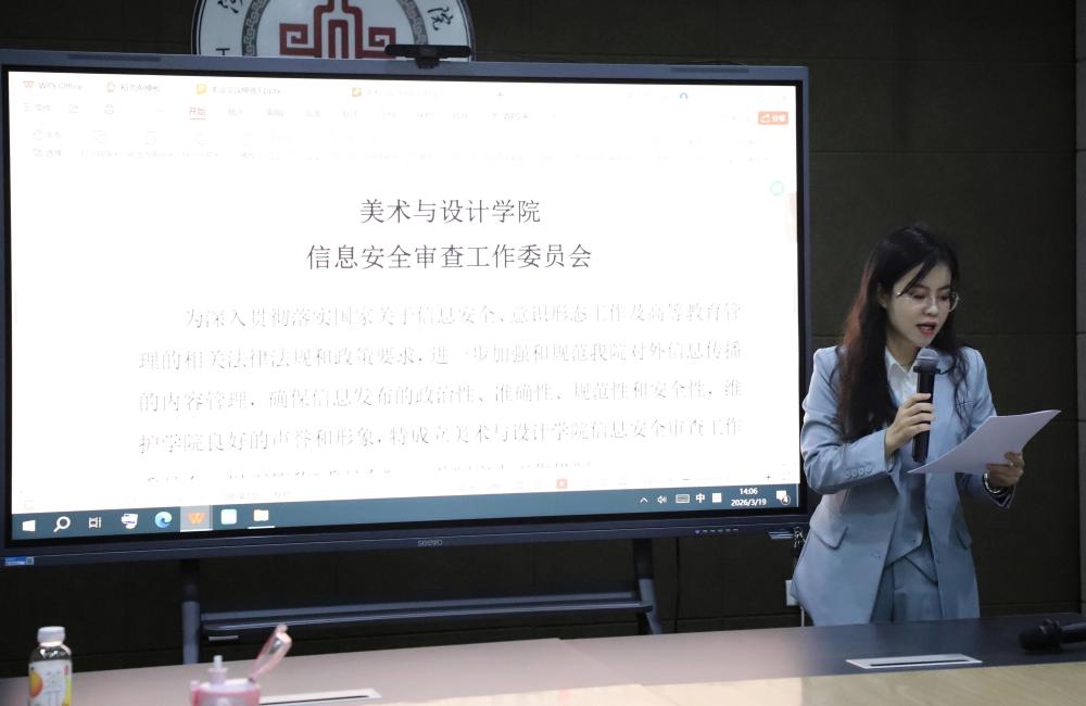 2026年3月19日下午,美术与设计学院召开AI赋能教学改革研讨会。会议聚焦AI时代教师专业角色重塑、信息安全审查机制建设、教学运行规范强化以及超星智慧教学平台深度应用四大核心议题,旨在应对人工智能迅猛发展趋势下的教育变革挑战,筑牢校园安全防线,推动教学模式创新。美术与设计学院院长蒋世国、常务副院长李英杰、副院长齐勇、赵昆,院长助理杨柳、梁世传及全体教师参加会议。会议由蒋世国院长主持。