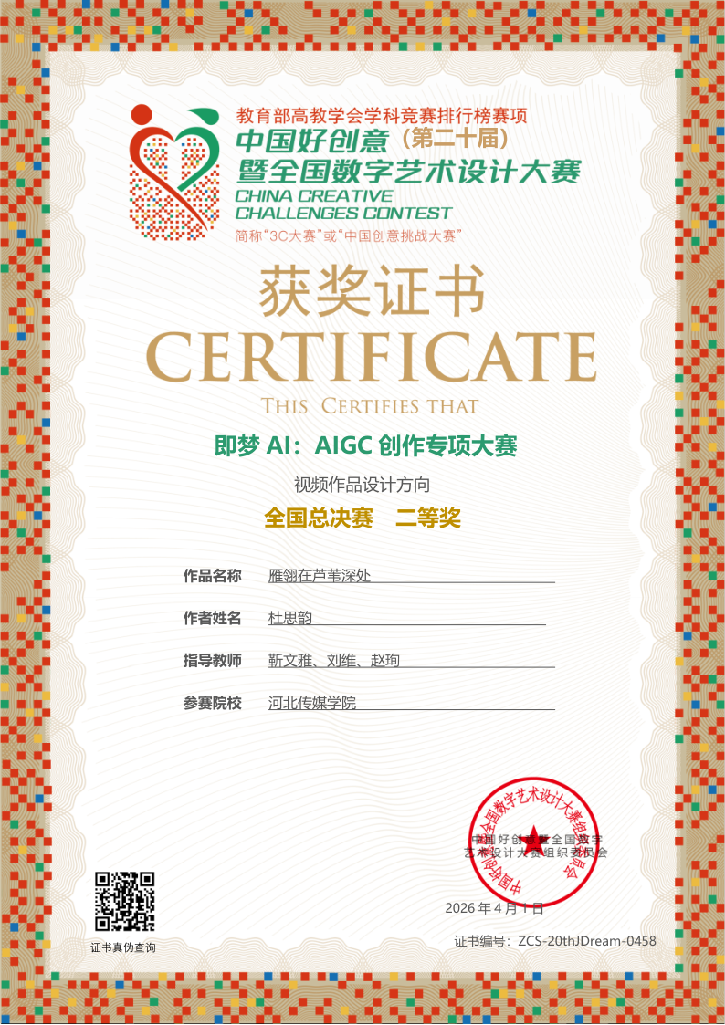 近日,第二十届中国好创意暨全国数字艺术设计大赛即梦AI:AIGC创作专项赛获奖结果正式公布,由我校新闻传播学院靳文雅、刘维和赵珣老师指导网络与新媒体专业学生创作的视频作品《雁翎在芦苇深处》,凭借出色创意与扎实技术脱颖而出,荣获全国二等奖。